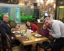 DLA Distribution Korea commander, Army Lt. Col. Mark D. Wolf and family celebrate with Raymond Hursh, DLA Distribution Korea quality assurance evaluator, at the Dec. 11 holiday party.