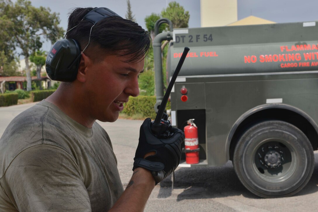 U.S. Air Force Airman 1st Class Trenton Beard, 39th Logistics Readiness Squadron fuels specialist, communicates through a land-mobile radio July 19, 2016, at Incirlik Air Base, Turkey. Radios are used to transmit messages between separated personnel across a network. (U.S. Air Force photo by Senior Airman John Nieves Camacho)