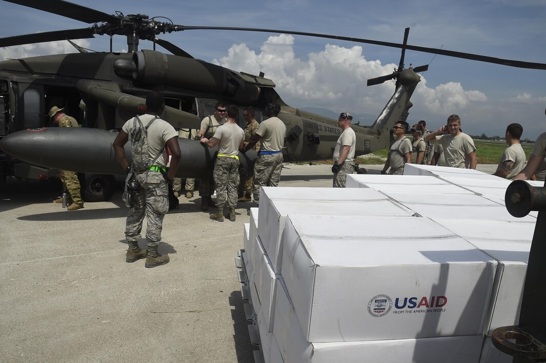 Airmen from the 621st Contingency Response Wing work with Marines from the Special Purpose Marine Air-Ground Task Force-South Command at Port-au-Prince, Haiti, October 10th, 2016.The CRW provides assistance by facilitating the flow of aid and cargo to those in need. (U.S. Air Force photo by Staff Sgt. Robert Waggoner/released)