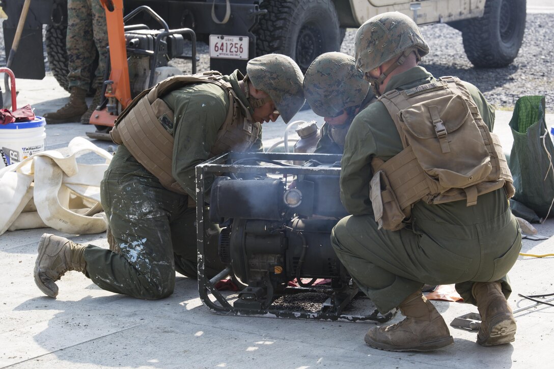 U.S. Marine Corps Lance Cpls. Jorge Lares, left, Ashley Garcia, middle, and Austin Berube, right, combat engineers with Marine Wing Support Squadron (MWSS) 171, attempt to fix a generator during unit level training at Marine Corps Air Station Iwakuni, Japan, Nov. 17, 2016. The focused on base recovery exercises to better prepare the Marines for scenarios that could arise while on station or during deployment. (U.S. Marine Corps photo by Lance Cpl. Joseph Abrego)