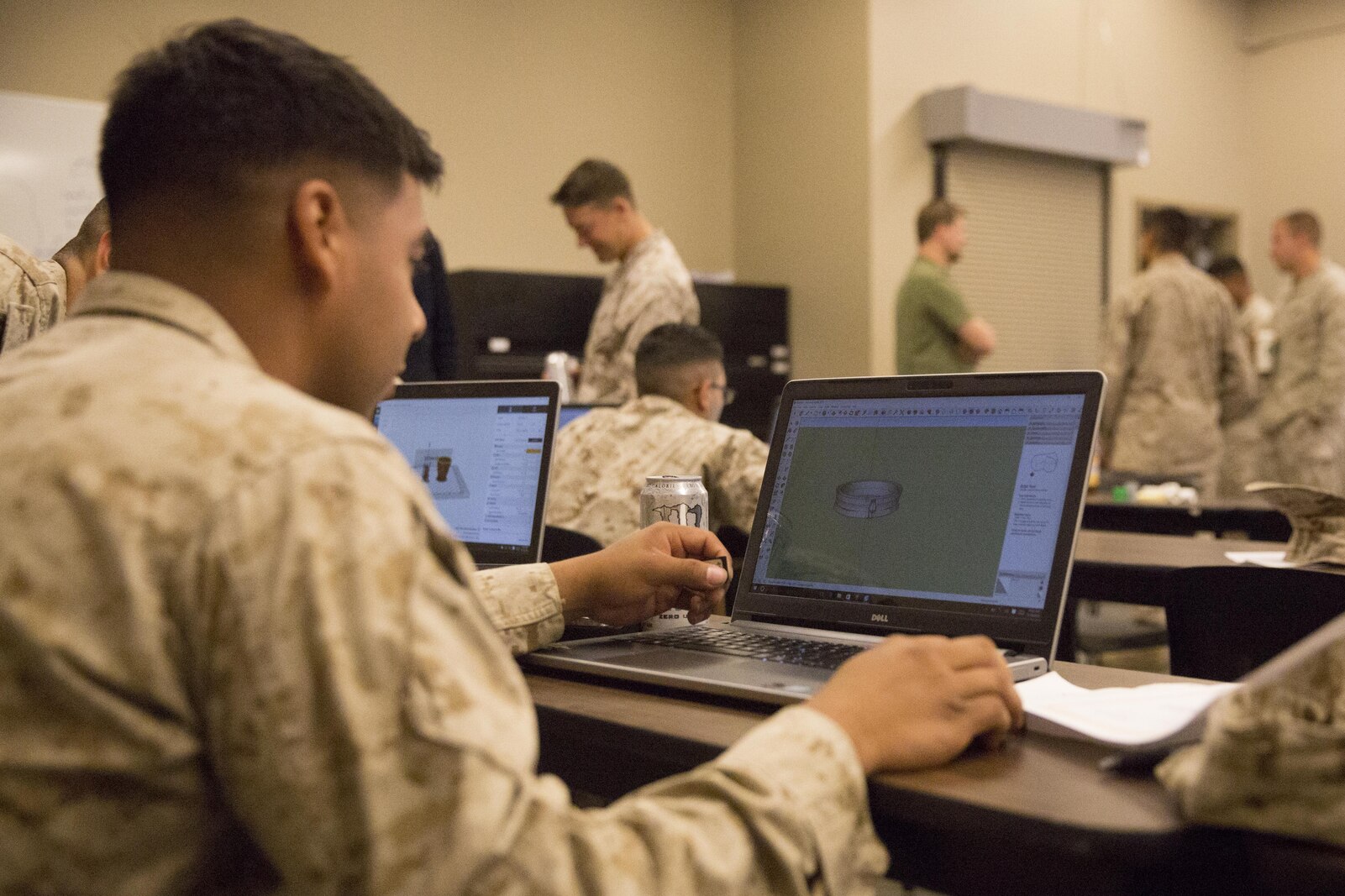 A Marine with 1st Battalion, 7th Marine Regiment, constructs an object using 3D printing technology during a 3D printing class aboard Marine Corps Air Ground Combat Center, Twentynine Palms, Calif., Nov. 16, 2016. Over the three-day course, Marines were challenged to manufacture innovative solutions for the problems presented to them using 3D printing innovation. (Official Marine Corps photo by Cpl. Medina Ayala-Lo/Released)