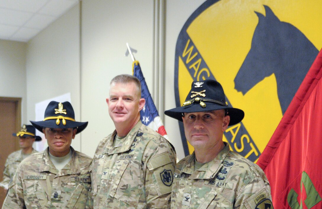 Command Sgt. Maj. Jill Crosby, Col. Rick Ellis and Col. Chris Colavita pose for a picture following the award ceremony.