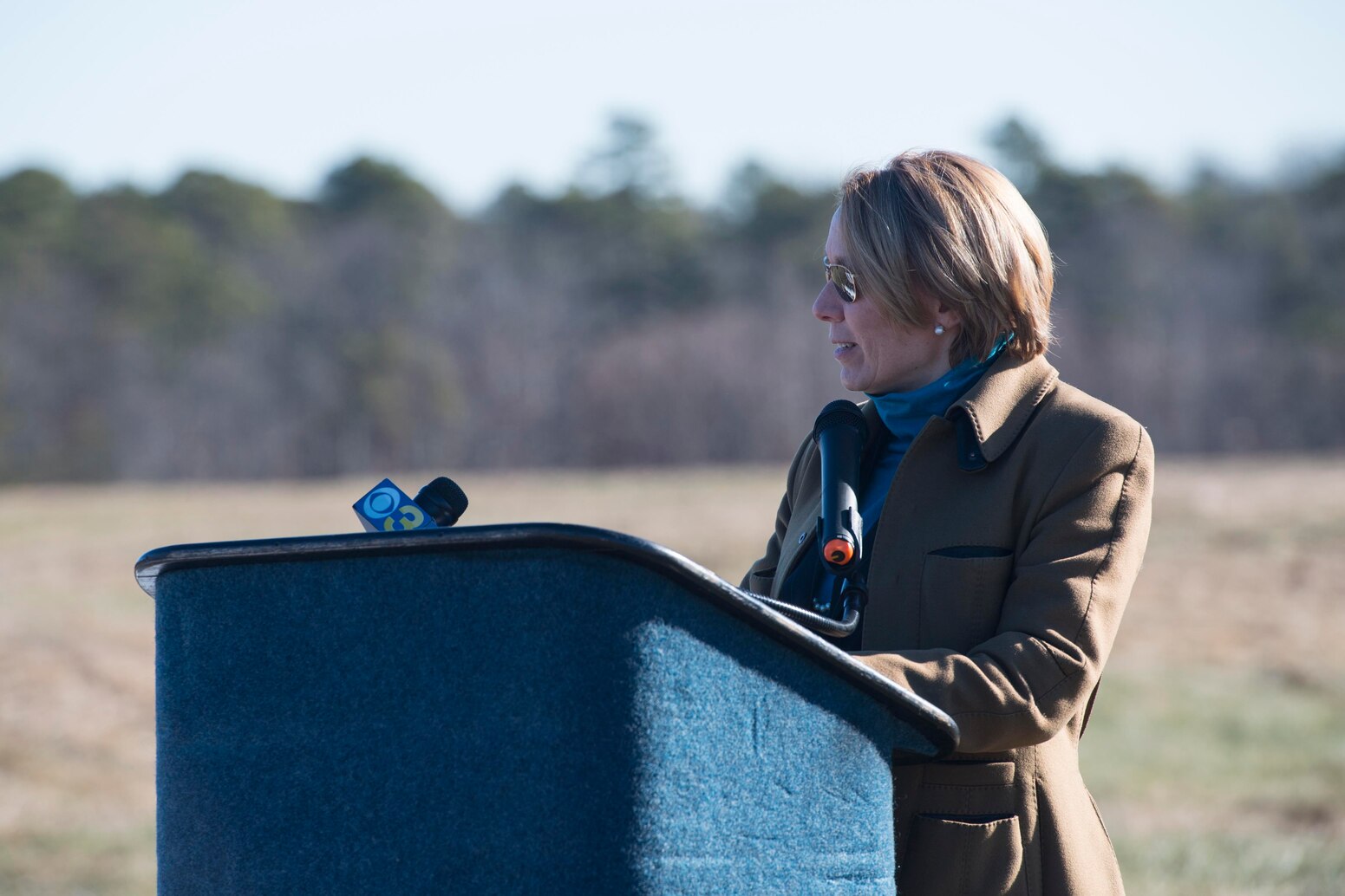 Assistant Secretary of the Air Force for Installations, Environment and Energy Miranda A.A. Ballentine speaks at the ground breaking at Joint Base McGuire-Dix-Lakehurst, N.J. Dec. 21. The 16.5 megawatt solar energy project will be the largest military solar installation in the Northeast and will include more than 50,000 solar panels when it’s completed in 2017.