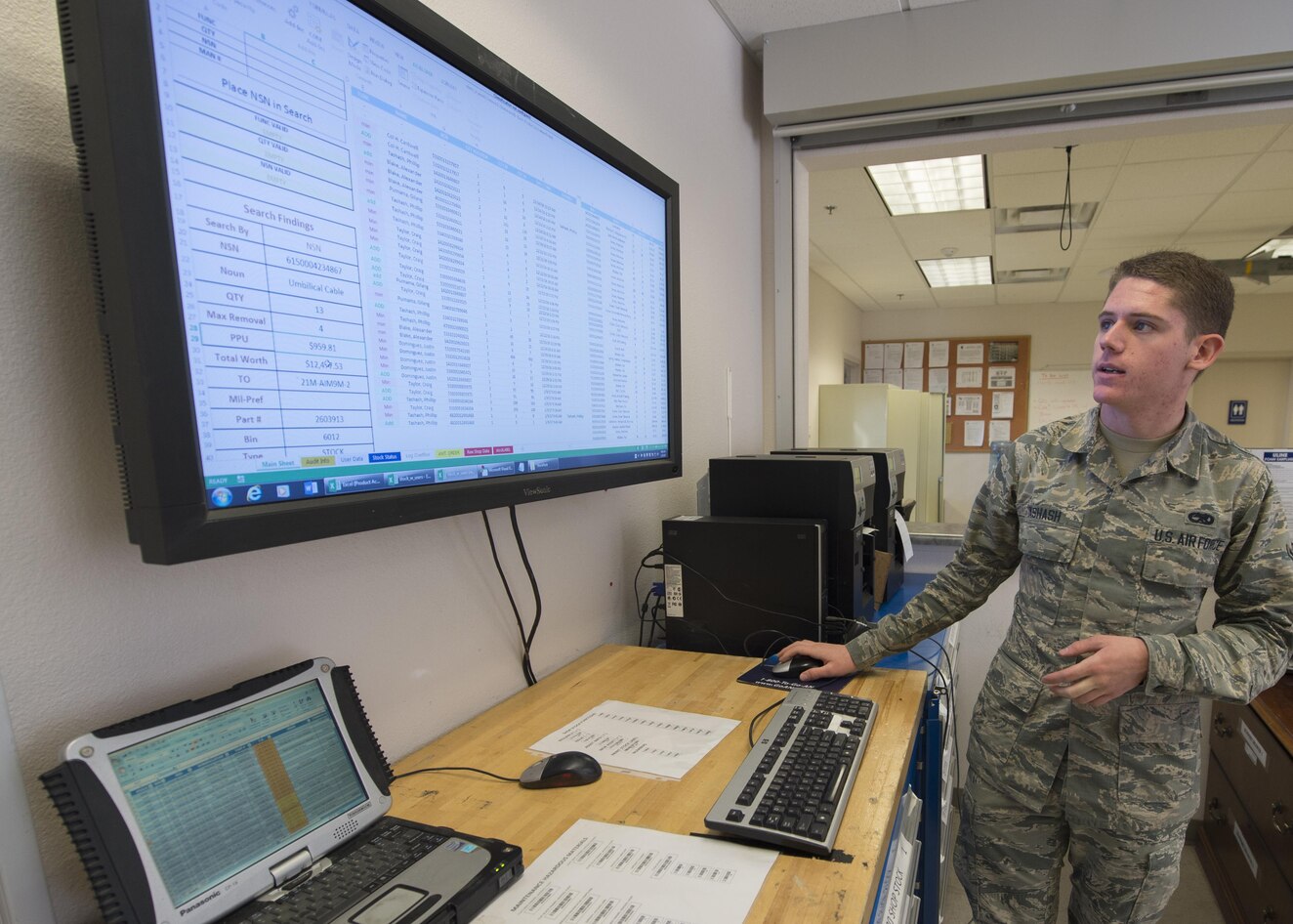 Airman Phillip Tashash, a 49th Maintenance Squadron munitions specialist, does an inventory transaction using the Automated Supply Accountability Program, Jan. 9, 2017, at Holloman Air Force Base, N.M. The ASAP is a new program that Holloman’s AMMO flight uses to track quantity and prices of assets. Tashash created the program, which allows personnel to perform accurate transactions in 10 seconds, rather than five minutes with the old system. (U.S. Air Force photo by Senior Airman Emily Kenney)