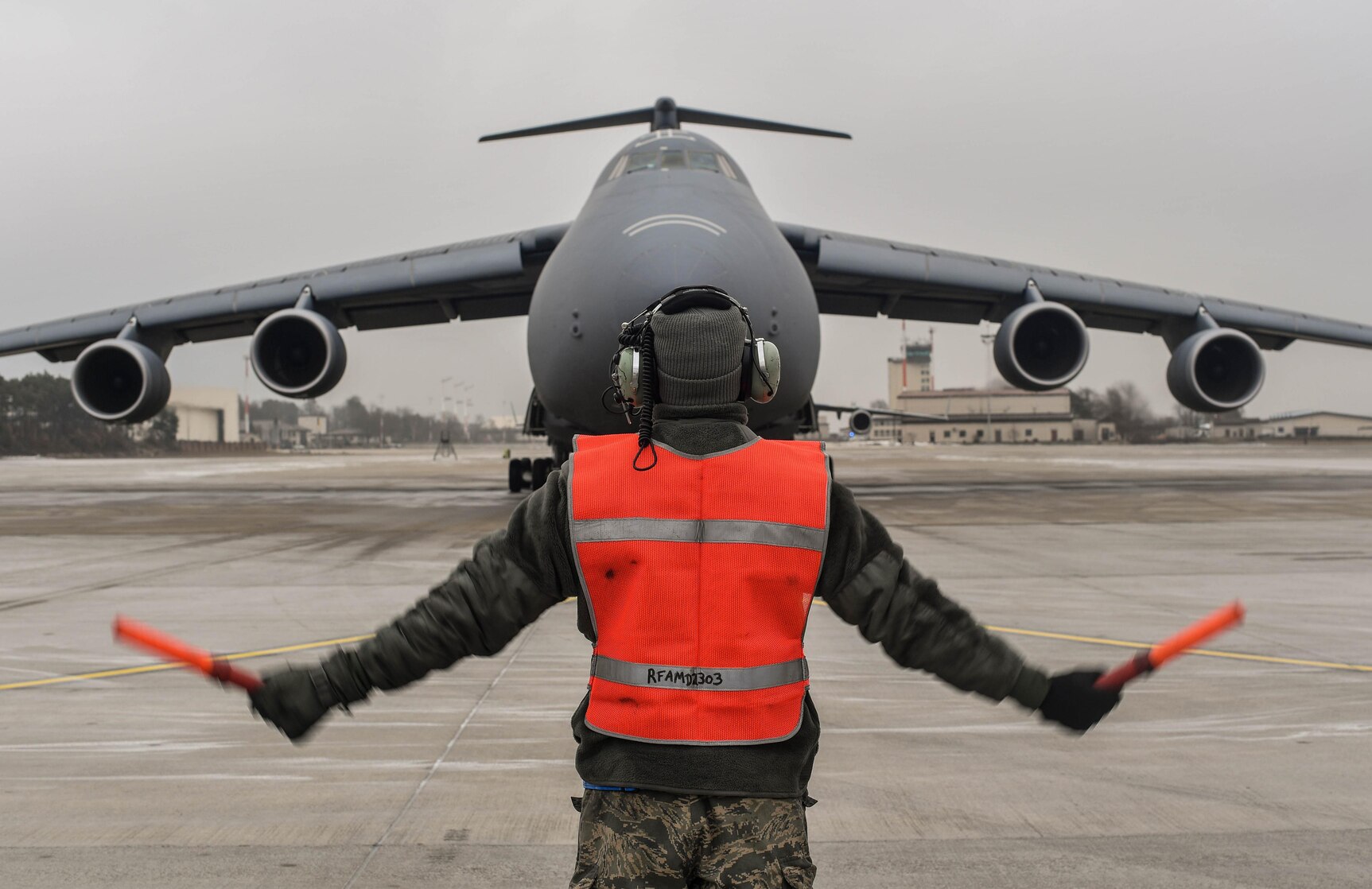 Senior Airman Earl Shelton, 721st Aircraft Maintenance Squadron aerospace maintenance technician, marshals a C-5M Super Galaxy into place at Ramstein Air Base, Germany, Jan. 24, 2017. After it was in place, 721st AMXS Airmen chocked the wheels, plugged it into a generator, checked tire pressure, refilled oil, and refueled the aircraft. On average, the 721st AMXS inspects, services, and repairs 30 aircraft in a single day, as part of the 521st Air Mobility Operations Wing at Ramstein. (U.S. Air Force photo by Senior Airman Tryphena Mayhugh)
