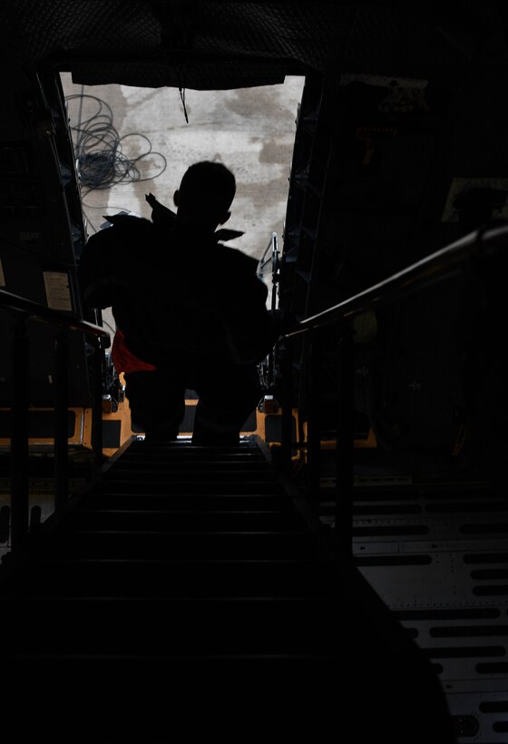Staff Sgt. Zachary Rodewig, 721st Aircraft Maintenance Squadron C-5 Galaxy crew chief, descends a ladder from the flight deck of C-5 at Ramstein Air Base, Germany, Jan. 24, 2017. Rodewig chocked the wheels, checked the tire pressure, and refueled the aircraft. On average, the 721st AMXS inspects, services, and repairs 30 aircraft in a single day, as part of the 521st Air Mobility Operations Wing at Ramstein. (U.S. Air Force photo by Senior Airman Tryphena Mayhugh)