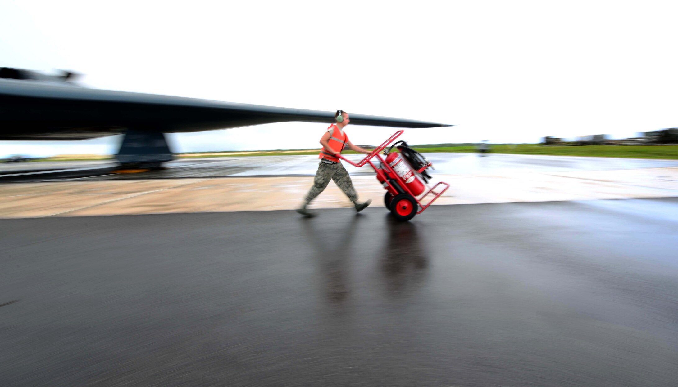 U.S. Air Force Senior Airman Richard Huartson, a crew chief assigned to the 509th Aircraft Maintenance Squadron, walks the fire extinguisher off the parkway prior to a U.S. Air Force B-2 Spirit aircraft takeoff at Andersen Air Force Base, Guam, Jan. 12, 2017. Close to 200 Airmen from Whiteman Air Force Base, Mo., and Barksdale Air Force Base, La., deployed to Andersen AFB, in support of U.S. Strategic Command Bomber and Deterrence missions. USSTRATCOM bomber missions familiarize aircrew with airbases and operations in different Geographic Combatant Commands. (U.S. Air Force photo by Tech. Sgt. Andy M. Kin)
