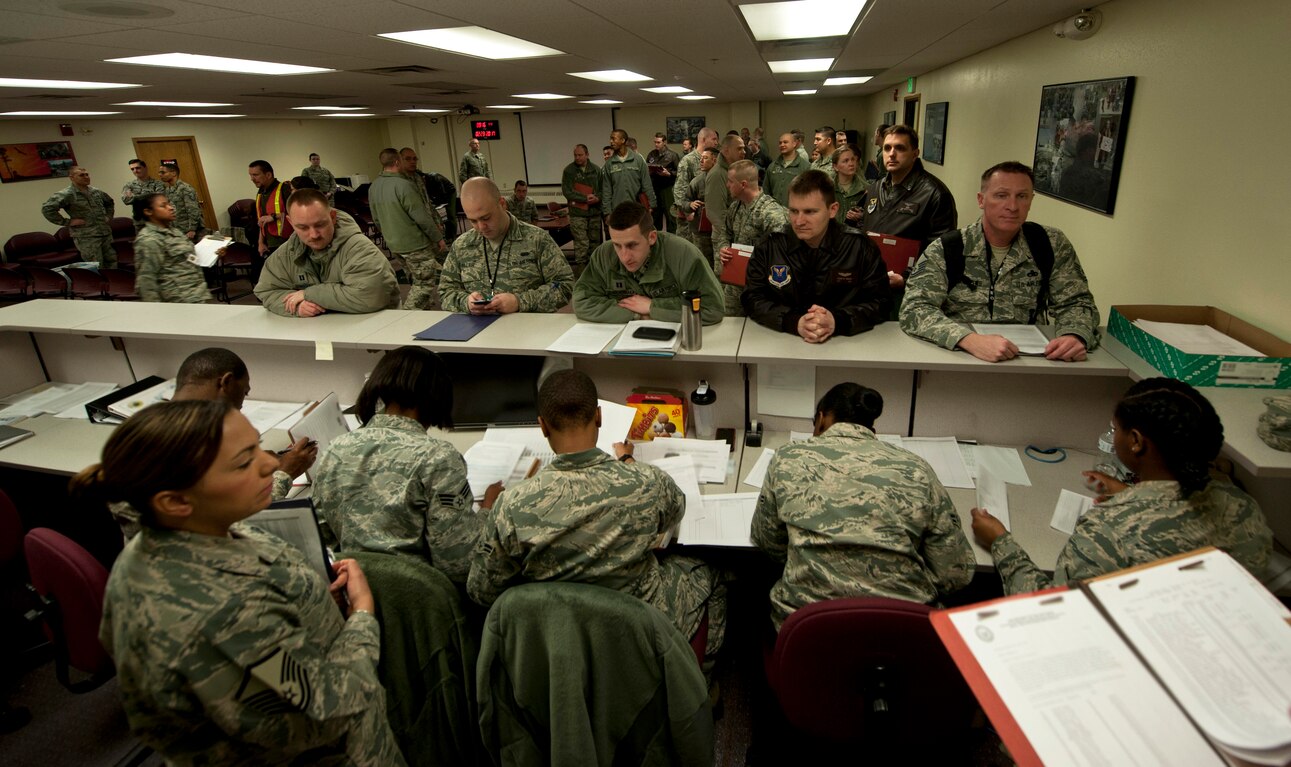 Deployers go through a personnel deployment function line at Minot Air Force Base, N.D., Feb. 23, 2017. Prior to their departure, each deployer must go through a PDF line, which inspects all of their deployment required paperwork. (U.S. Air Force photo/Airman 1st Class Jonathan McElderry)