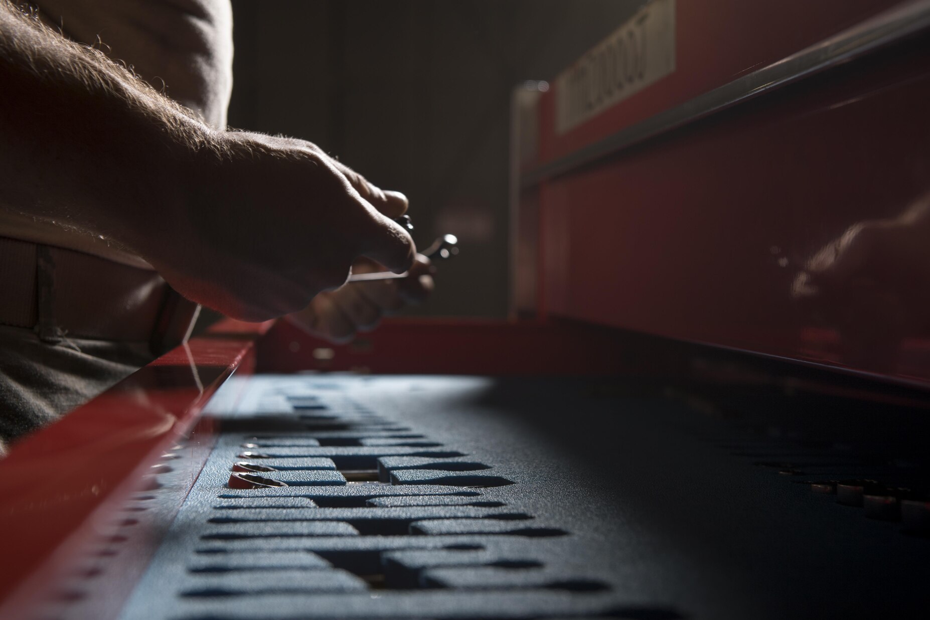 Airman 1st Class Foster Griffith, 374th Maintenance Squadron, aerospace propulsion apprentice, looks for the proper tool during an aircraft maintenance course, Aug. 23, 2017, at Yokota Air Base, Japan. The course included students from both the Philippine Air Force and the U.S. Air Force. (U.S. Air Force photo by Airman 1st Class Donald Hudson)