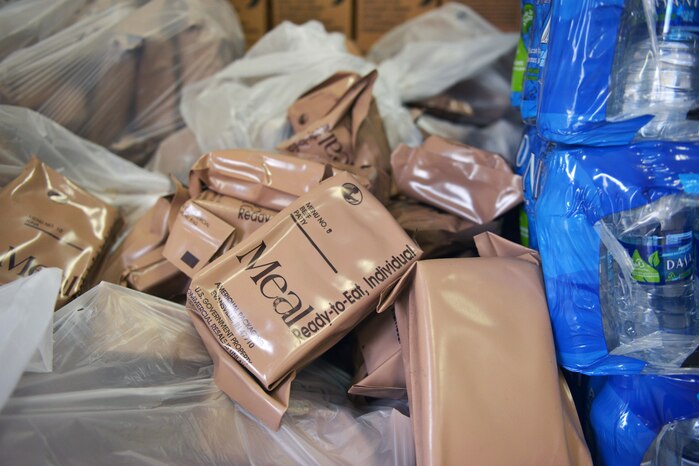 The Hurricane Irma Incident Command Post has bags of Ready-to-Eat meals and cases of water prepared at Coast Guard Sector San Juan in Puerto Rico, Sept. 6, 2017. Coast Guard photo by Petty Officer 2nd Class Jonathan Lally