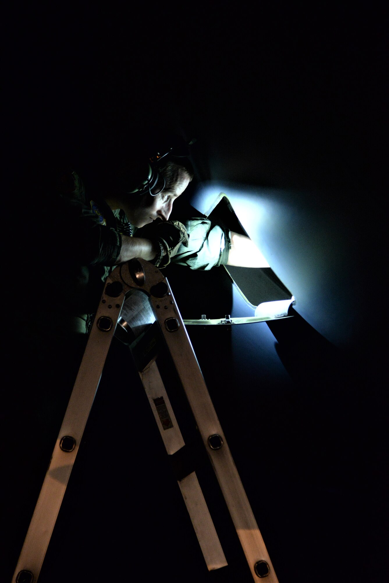 Staff Sgt. Herbert Scott, 736th Aircraft Maintenance Squadron flying crew chief, check the status of an engine in a C-17 Globemaster III during a hurricane relief mission at San Juan Luis Muñoz Marín Airport in San Juan, Puerto Rico, on Sept. 30, 2017. Reach 7170 delivered 118 thousand pounds of meals ready to eat and bottled water to be distributed throughout a devastated Puerto Rico with the help of Airmen from the 123rd Contingency Response Group. (U.S. Air Force photo by Tech. Sgt. Matt Davis)