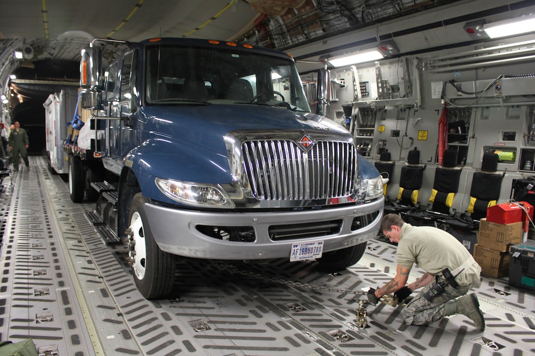 Airmen from the 123rd Airlift Wing load a Disaster Relief Mobile Kitchen Trailer onto a C-17 Globemaster III aircraft at the Kentucky Air National Guard Base in Louisville, Ky., Oct. 11, 2017, to be transported to San Juan, Puerto Rico. Seven Airmen from the wing’s 123rd Services Flight will employ the trailer to serve up to 4,000 hot meals per day to hurricane relief forces. (U.S. Air National Guard photo by Lt. Col. Katrina Bramlett)