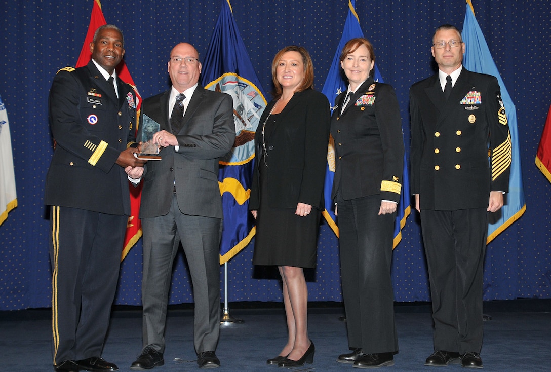 DLA Land and Maritime's Christopher Smitley (second from left) received the Acquisition Workforce Contracting and Purchase award during an agency ceremony Dec. 12. Also pictured are (from left) DLA Director Army Lt. Gen. Darrell Williams; DLA Acquisition Executive Roxanne Banks; DLA Land and Maritime Commander Rear Adm. Michelle Skubic; and Command Master Chief Shaun Brahmsteadt, senior enlisted adviser.