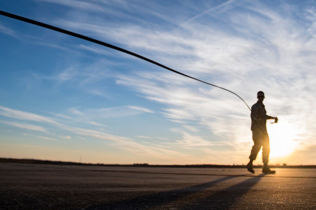Airman 1st Class Evan Valance, 23d Logistics Readiness Squadron fuels distribution operator, drags a trigger hose away from a M-11 refueling truck to conduct HH-60G Pave Hawk hot-pit refueling operations, Jan. 16, 2018 at Moody Air Force Base, Ga. Airmen who work in the petroleum, oils and lubricants (POL) flight frequently use hot pit refueling, which is a more efficient tactic that allows aircrews a quick transition from the flight line back to their current objective. (U.S. Air Force photo by Senior Airman Daniel Snider)