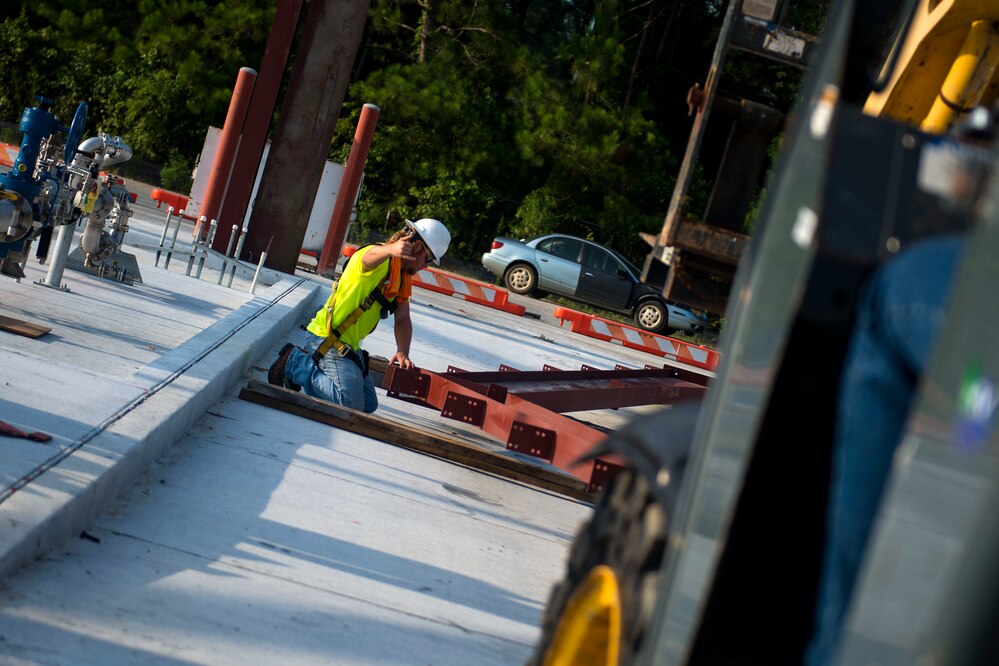 Donovan Graddy, a civilian metal roof installer, guides a rafter for the canopy of the fill stand used for fueling up the trucks in the 23d Logistics Readiness Squadron (LRS) fuel yard, July 18, 2018, at Moody Air Force Base, Ga. For the first time since the 1950s, the 23d LRS is modernizing the yard to improve fuel efficiency to enhance operations. (U.S. Air Force photo by Airman 1st Class Erick Requadt)