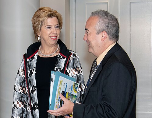 Undersecretary of Defense for Acquisition and Sustainment Ellen Lord (left) talks about the National Defense Strategy with Kim Herrington, acting principal director of defense pricing and contracting, during DLA Industry Day July 31 at the McNamara Headquarters Complex on Fort Belvoir, Virginia. Photo by Teodora Mocanu
