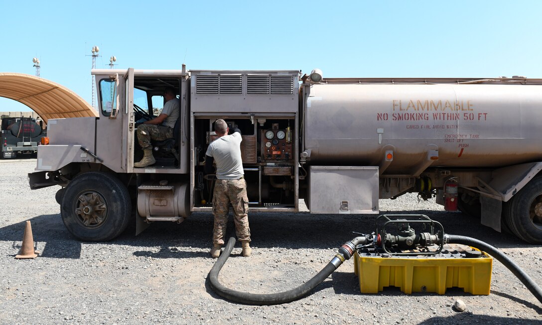 U.S. Air Force Tech. Sgt. James Hopper, left, 726th Expeditionary Air Base Squadron Vehicle Maintenance flight chief, and Staff Sgt. Jared Agey, 726th EABS Vehicle Maintenance NCO in-charge, perform a meter calibration on an R11 refueling truck at Chabelley Airfield, Djibouti, Nov. 8, 2019. Along with refuelers, the 726th EABS Vehicle Maintenance team members sustain a fleet of passenger vehicles, forklifts, ambulances, cranes and many other types of equipment. (U.S. Air Force photo by Staff Sgt. Alex Fox Echols III)