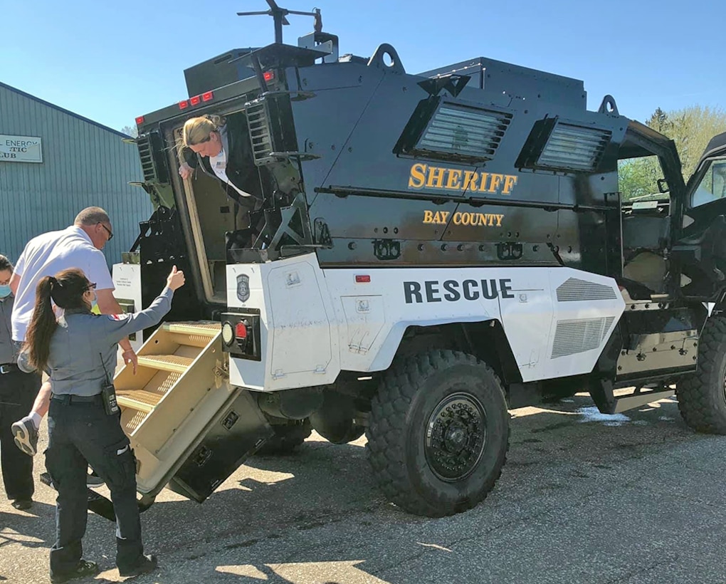 Bay County Sheriff deputies help displaced Saginaw Township residents exit a Mine-Resistant, Ambush-Protected vehicle after making residential floodwater rescues in Michigan May 20. Law enforcement agencies around the country rely on the Defense Logistics Agency for excess military property, including MRAPs, to serve their communities.