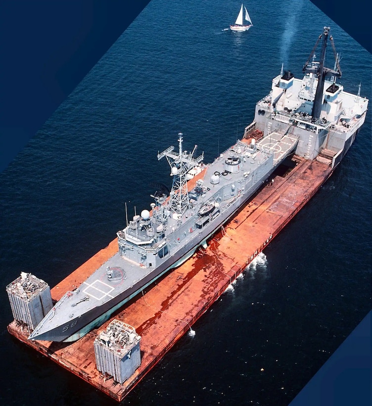 30 July 1988: Newport, R.I. - Aerial view of the Dutch heavy lift ship Mighty Servant 2 transporting Samuel B. Roberts (FFG 58). The frigate was damaged when it struck a mine while on patrol in the Persian Gulf. U.S. Navy photo by PH2(SW) Jeff Elliott