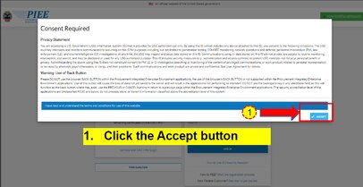 Picture of Consent Information pop-up after clicking on the blue login button on the PIEE home page. Read consent information to using PIEE and click the blue accept button in the bottom right hand corner of the pop-up.
