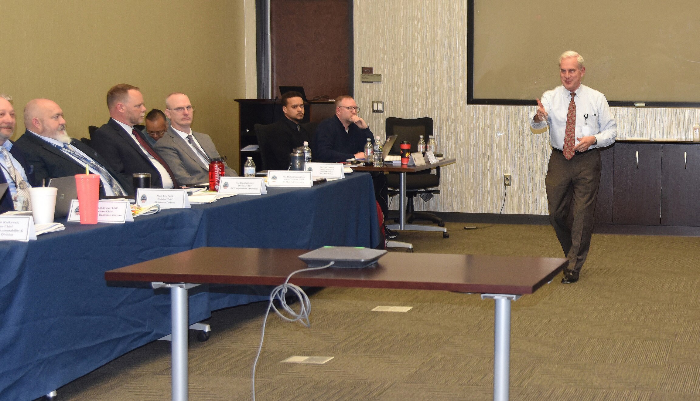 Defense Logistics Agency Distribution Deputy Commander, Perry Knight, delivers closing comments during the Warehouse Management System in-stride review for working groups at DLA Distribution headquarters March 15, 2023.