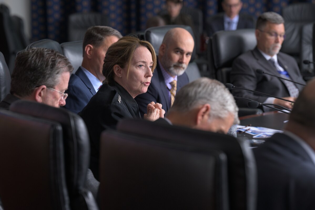 Defense Logistics Agency Director Navy Vice Adm. Michelle Skubic speaks to the attendees at the agency’s Industry Association Meeting, held April 25, 2023, at the McNamara Headquarters Complex at Fort Belvoir, Virginia. The agency provided an update on its demand forecast and most recent supplier survey during the meeting, and there were discussions between the agency and the industry associations that attended. (Photo by Christopher Lynch)