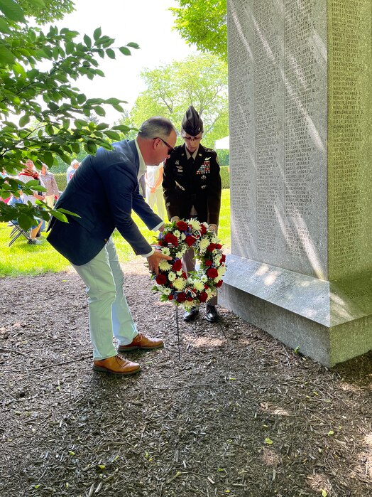 Army Brig. Gen. Gail Atkins and Bexley Mayor Benn Kessler lay a wreath at the base of Bexley, Ohio’s World War II Memorial May 29. Atkins, commander of the Defense Logistics Agency Land and Maritime and Defense Supply Center Columbus, delivered keynote remarks at the city’s Memorial Day observance. Bexley is located a few miles from the neighboring DSCC military installation in Central Ohio.