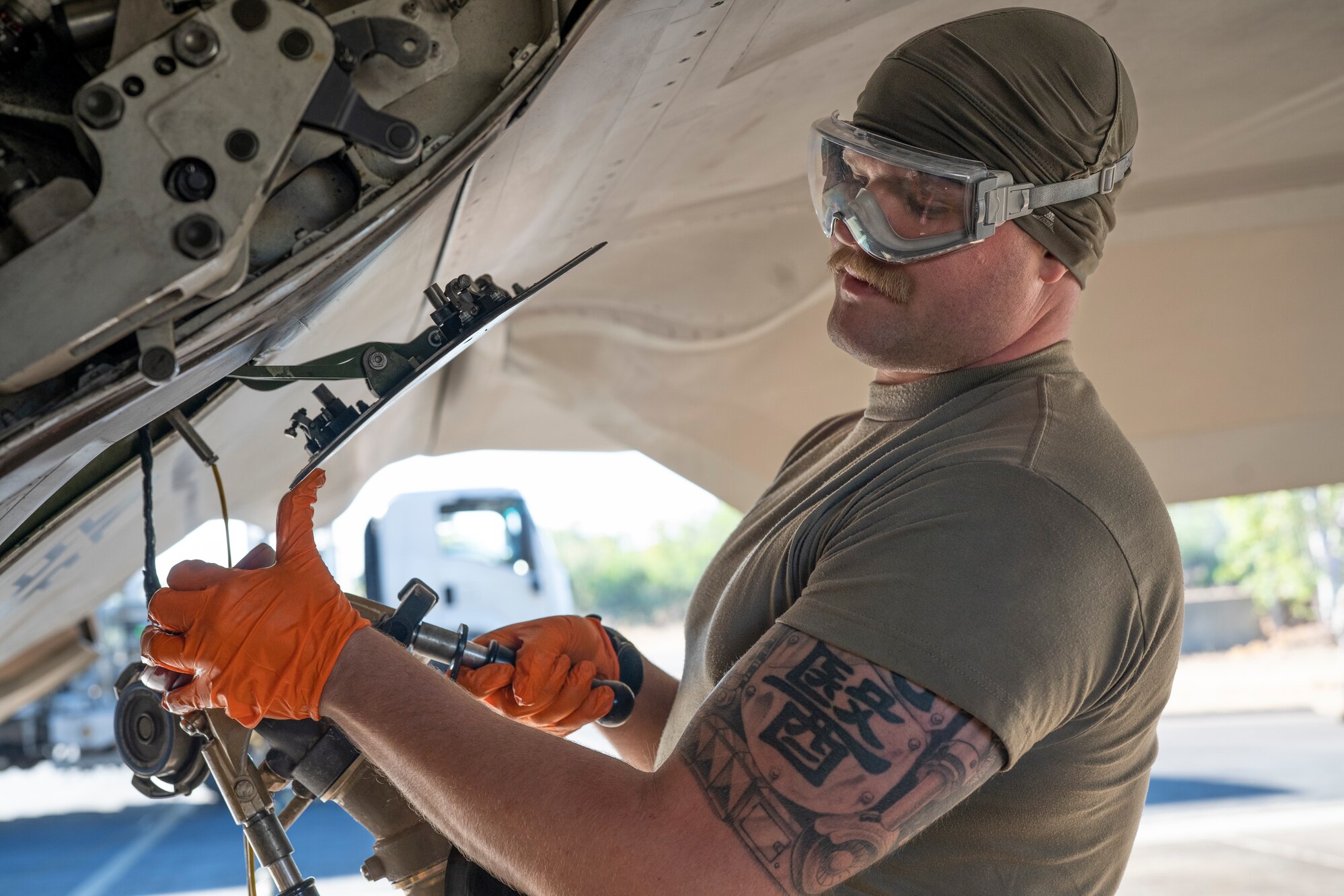 U.S. Air Force Senior Airman Blake Schibig, dedicated crew chief assigned to the 199th Expeditionary Fighter Squadron, removes a fuel hose from a F-22 Raptor during Talisman Sabre at Royal Australian Air Force Base Tindal, Australia, July 25, 2023. The Defense Logistics Agency provided pre-planned food and fuel support during the exercise and was also on the ground to assess emerging needs in an area where DLA has a minimal footprint. Photo by Air Force Senior Airman J. Michael Peña