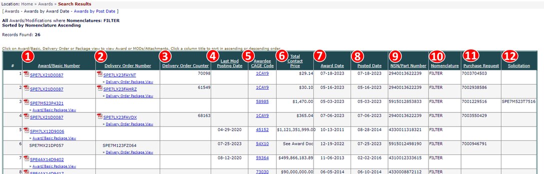 The search results page appears with a table of contracts/awards that fit the criteria entered previously into the DIBBS Awards Database Search.