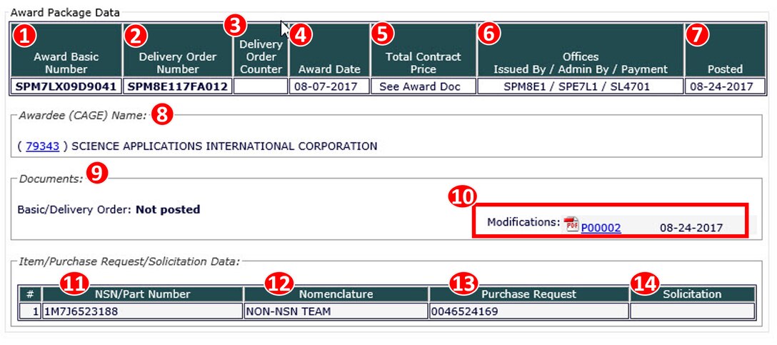 When selecting an Award/Basic Number or Delivery Order link from the search results table the Award Record Page (also known as Award Package Data) will appear giving additional details including (but not limited to) any modifications or items associated with contract/award.