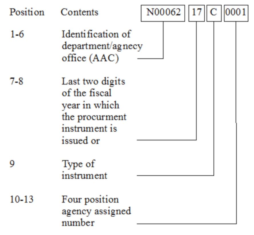 The positions in the Procurement Instrument Identification Number identify characteristics about the contract number (PIID). Positions 1-6 identify the department/agency office (AAC). Positions 7-8 identify the last two digits of the fiscal year in which the procurement instrument is issued. Position 9 identifies the type of procurement instrument. Positions 10-13 identify the agency assigned number.