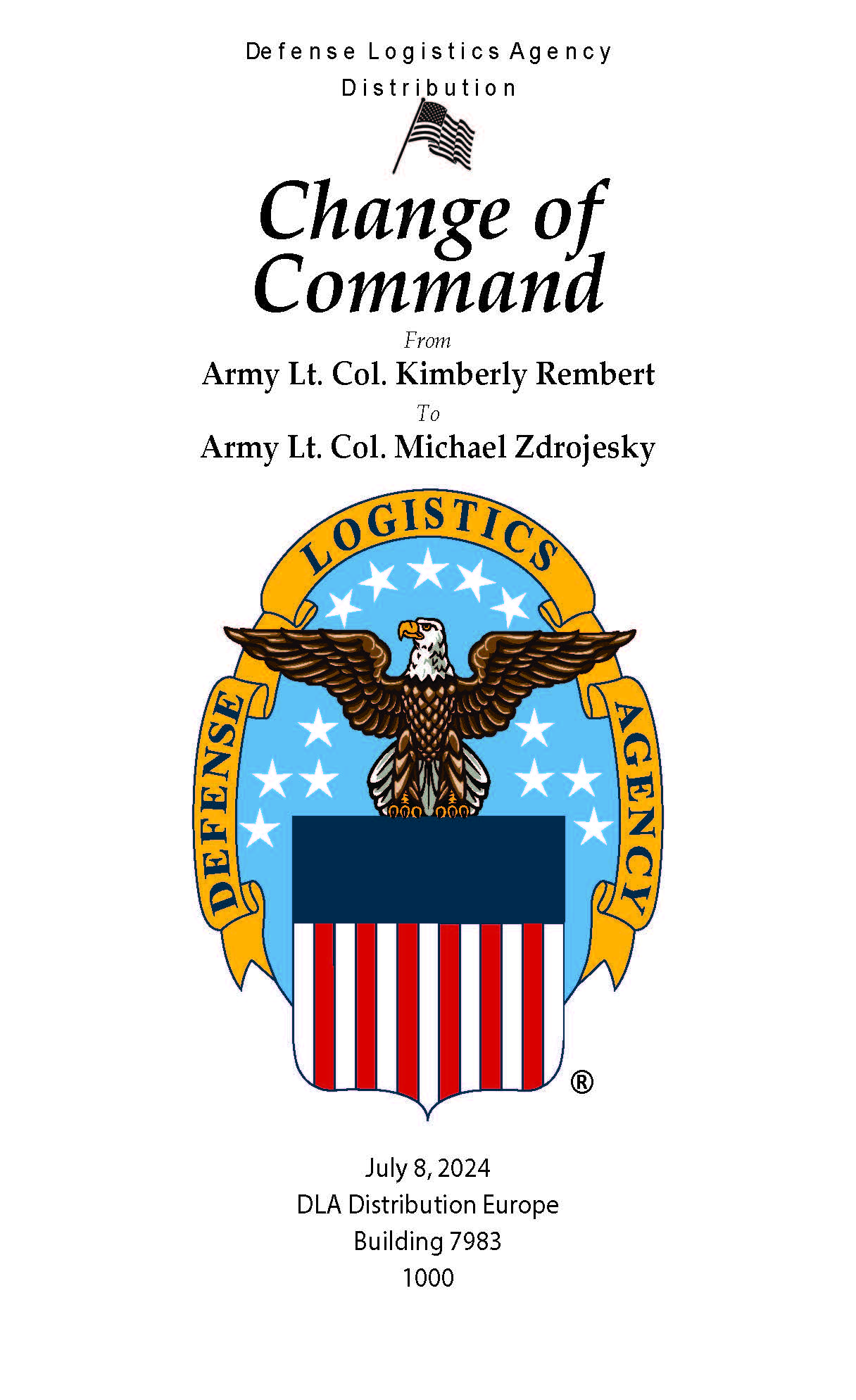 Army Lt. Col. Kimberly Rembert relinquished command of Defense Logistics Agency Europe to Army Lt. Col. Michael Zdrojesky during a ceremony held in Germersheim, Germany, July 8. Army Col. Adrian “AJ” Sullivan, commander, DLA Europe and Africa, presided over the ceremony.