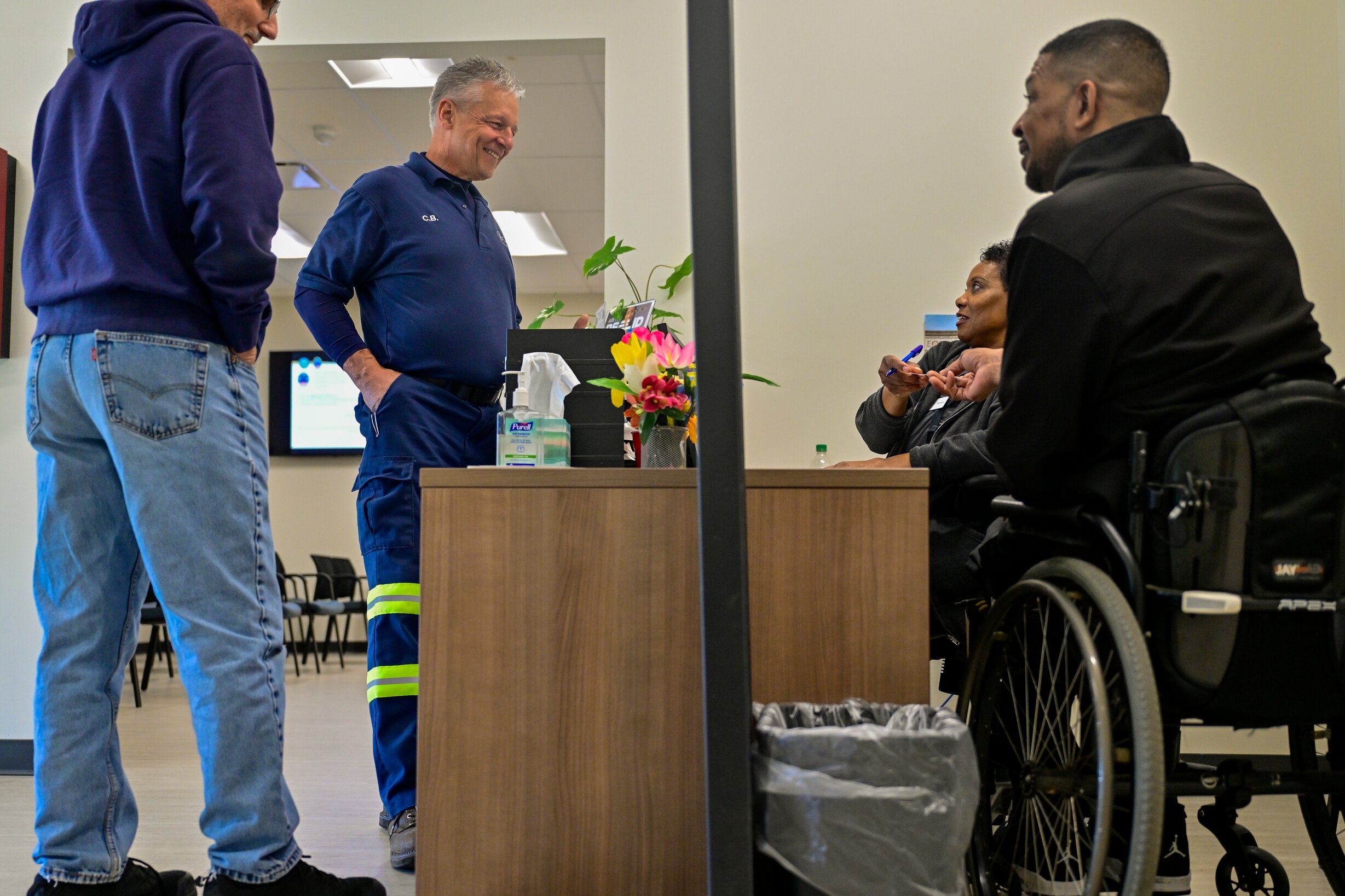 Leroy Stanford, DSCR Visitor Control Center supervisor, assisting customers with VCC Clerk, Florence Smith. Both are employed at Defense Supply Center Richmond through SOAR365, a Richmond-based AbilityOne federal contractor.