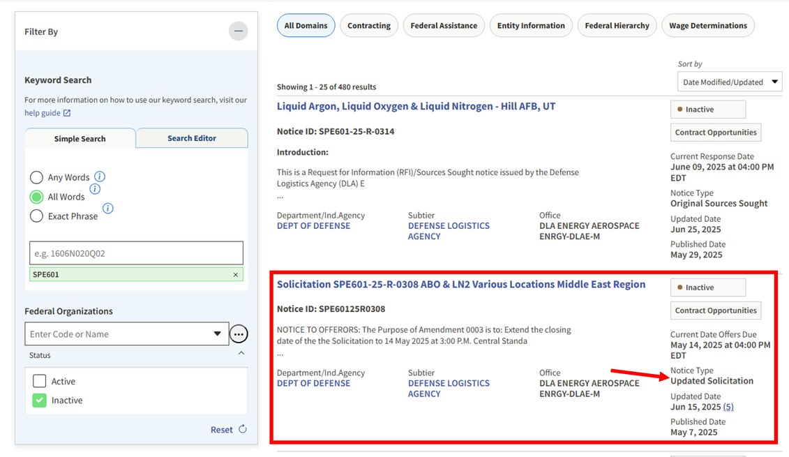 When conducting market research into DLA Energy Aerospace SAM.gov solicitations, identify those that have the Notice type Solicitation or Updated Solicitation to review DLA needs, attachments, and requirements of the past.