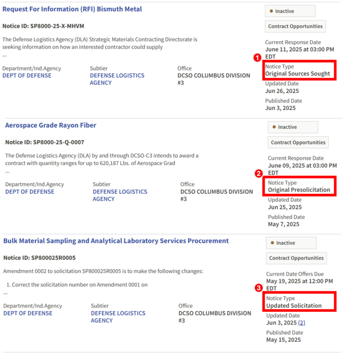 Examples of DLA Strategic Materials solicitation types on SAM.gov: Sources Sought, Pre-solicitation, and Solicitation.