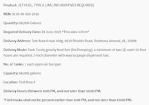 Example of delivery specifications outlined in a DLA Energy Direct Delivery PC&S solicitation on the System for Award Management (SAM.gov) giving information such as required delivery dates, address, delivery modes, and delivery hours. The example is product NSN 9130-00-359-2026 Turbine Fuel, Aviation Jet A.