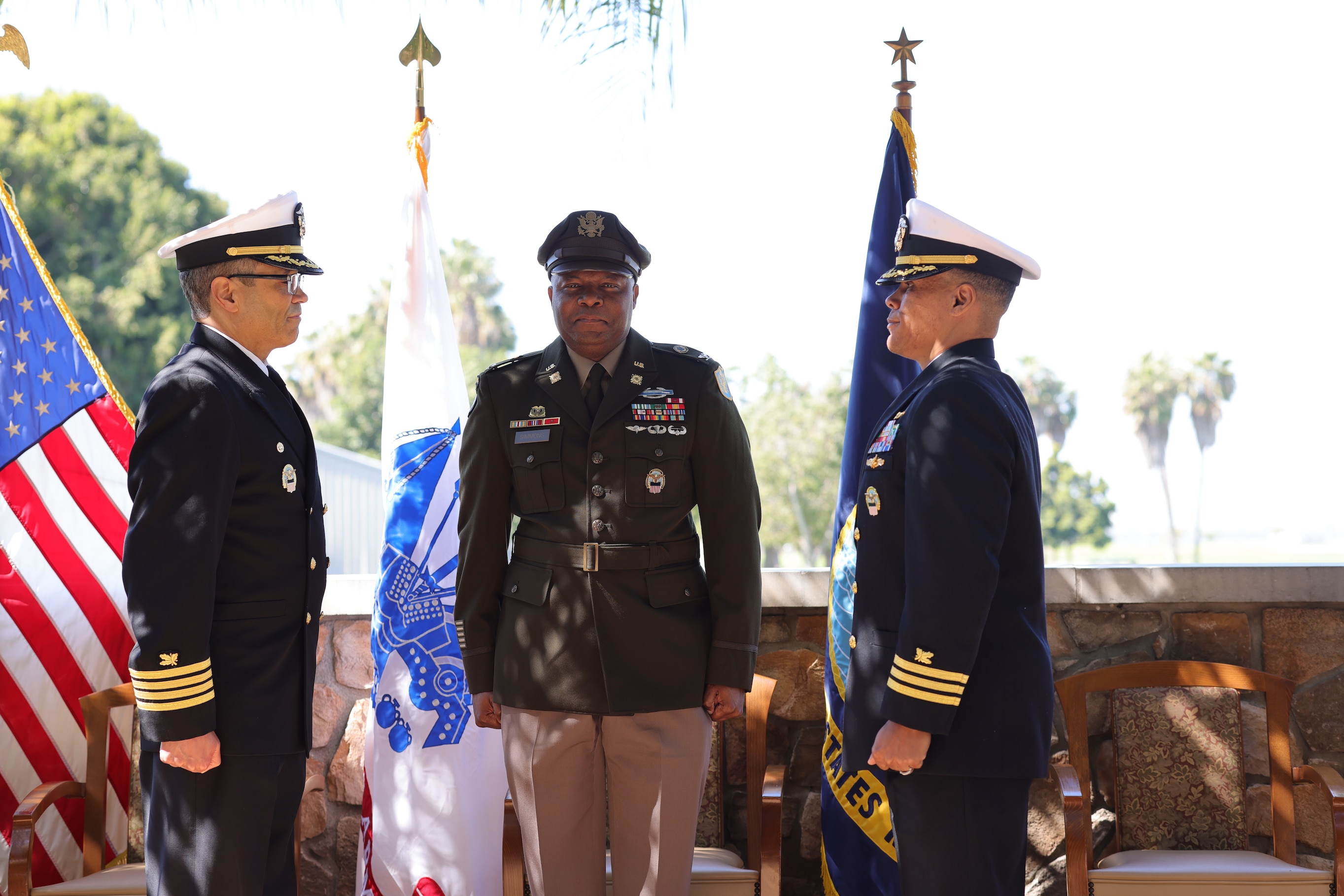 On 21 Mar 2025, Navy Cmdr. Brandon Palmer (right), assumed command of Defense logistics Agency Energy Americas West from Navy Capt. Anas Maazouzi (left), at the Naval Golf Course at Cypress, CA. The Commander of DLA Energy Americas, Army Col. Alphonso Simmons (center) presided over the ceremony. Photo courtesy of DLA Energy Americas West. Photo courtesy of DLA Energy Americas West.