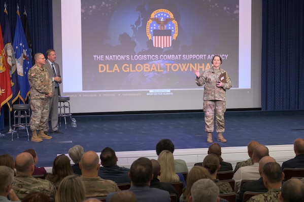 Defense Logistics Agency Senior Enlisted Leader Army Command Sgt. Maj. Petra Casarez takes the stage during the agency’s Global Town Hall Oct. 1, 2025. Photo by Christoper Lynch