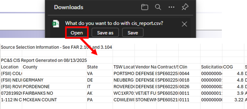 When searching DLA Energy Direct Delivery PC&S Contract Information System historical contract data a Supplier can Download the Excel Spreadsheet with contract data and then open to view.