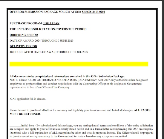 Example of a DLA Energy Direct Delivery PC&S Offer Submission Package document required to be filled out by Suppliers during the offer submission stage.