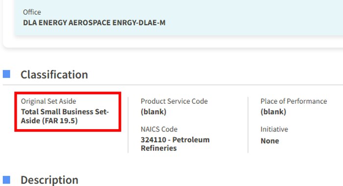 Example of a System for Award Management (SAM.gov) solicitation with a Total Small Business Set-Aside (FAR 19.5) available