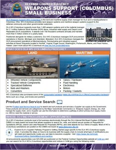 Weapons Support (Columbus) flyer providing information on what is procured, where to find procurement opportunities, major spend patterns, training opportunities, and contact info.