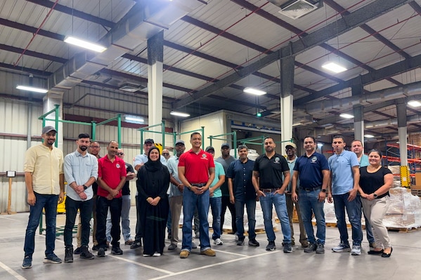 Defense Logistics Agency Distribution Bahrain Local Nationals, civilians, and military staff gather for a group photo following a ceremony to commemorate the official transition of Material Processing Center operations from Al Hidd to DLA Distribution Bahrain onboard Naval Support Activity Bahrain Nov. 2. (DOW photo by Mohammed Alaswad, released)
