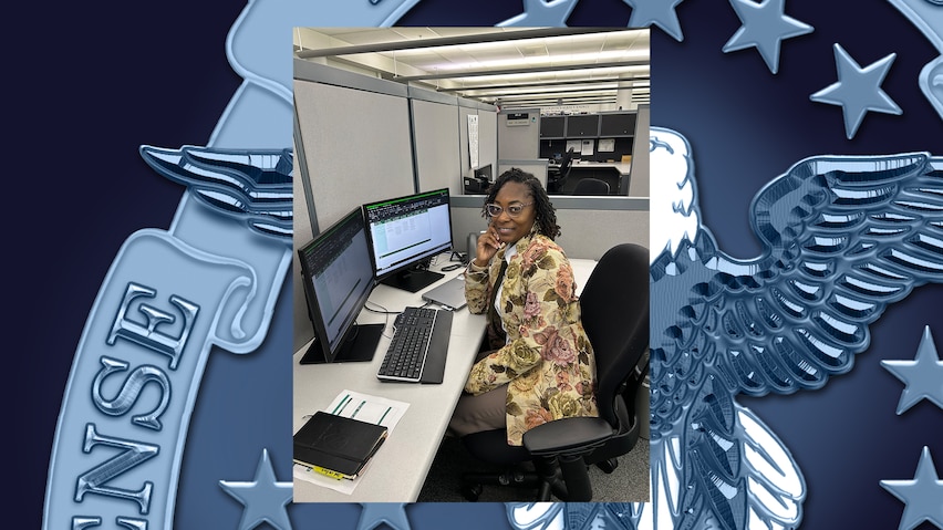 Army Master Sgt. Errica Watkins, a Department of Defense SkillBridge fellow for DLA Energy Americas North, sits at her desk while visiting DLA Energy Quality Technical Directorate at Fort Belvoir, Virginia. Watkins, a first-time participant in the program, completed her fellowship at DLA Energy from August to October 2025. (DLA Energy photo by Ebony Gay)