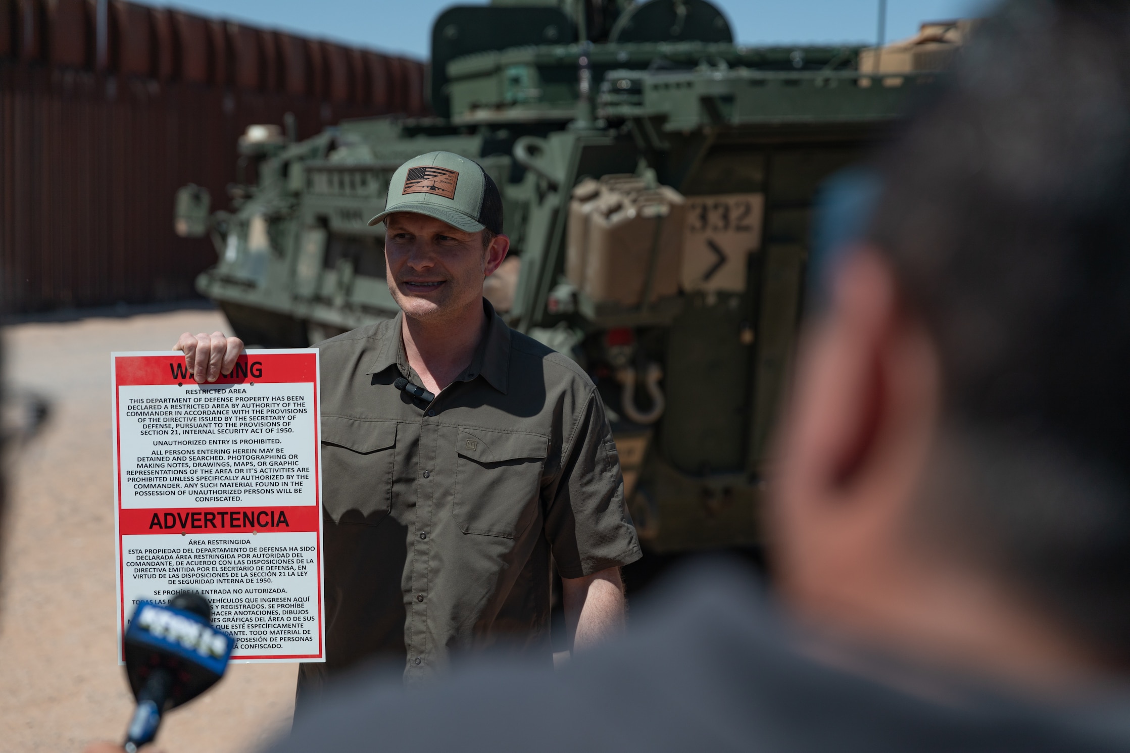 U.S. Secretary of Defense Pete Hegseth speaks to the press about the establishment of the New Mexico National Defense Area (NMNDA) along the southern border near Santa Teresa, N.M., April 25, 2025. U.S. Northern Command (USNORTHCOM) service members have been delegated the authority and directed to conduct installation security support operations in the NMNDA. Under the direction of USNORTHCOM, Joint Task Force – Southern Border's mission is to secure the territorial integrity of the southern border of the United States. USNORTHCOM is working together with the Department of Homeland Security to augment U.S. Customs and Border Protection along the southern border with additional military forces and unique military capabilities. (U.S. Army photo by Spc. Michael Graf)
