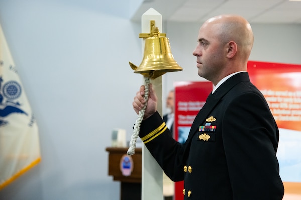 Navy Lt. j.g. Geoffrey Wilds, Defense Logistics Agency Distribution Susquehanna, performs a bell ringing ceremony as part of a Navy birthday ceremony. In recognition of the U.S. Navy’s 250th birthday Oct. 13, Defense Logistics Agency Distribution Susquehanna, Pennsylvania, hosted a traditional cake cutting ceremony Oct. 8. (DOW photo by Dorie Heyer, released)