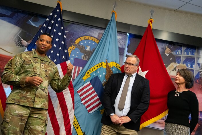 Army Brig. Gen. Kevin Cotman, commanding general, Defense Logistics Agency Distribution, provides remarks as he officiates a retirement ceremony for Gene Surmacz, chief of staff, DLA Distribution, at DLA Distribution headquarters in New Cumberland, Dec. 16. (DOW photo by Dorie Heyer, released)