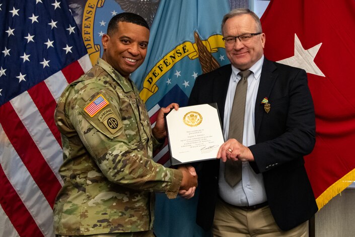 Army Brig. Gen. Kevin Cotman, commanding general, Defense Logistics Agency Distribution, presents a retirement certificate to Gene Surmacz, chief of staff, DLA Distribution, during his retirement ceremony at DLA Distribution headquarters in New Cumberland, Dec. 16. (DOW photo by Dorie Heyer, released)