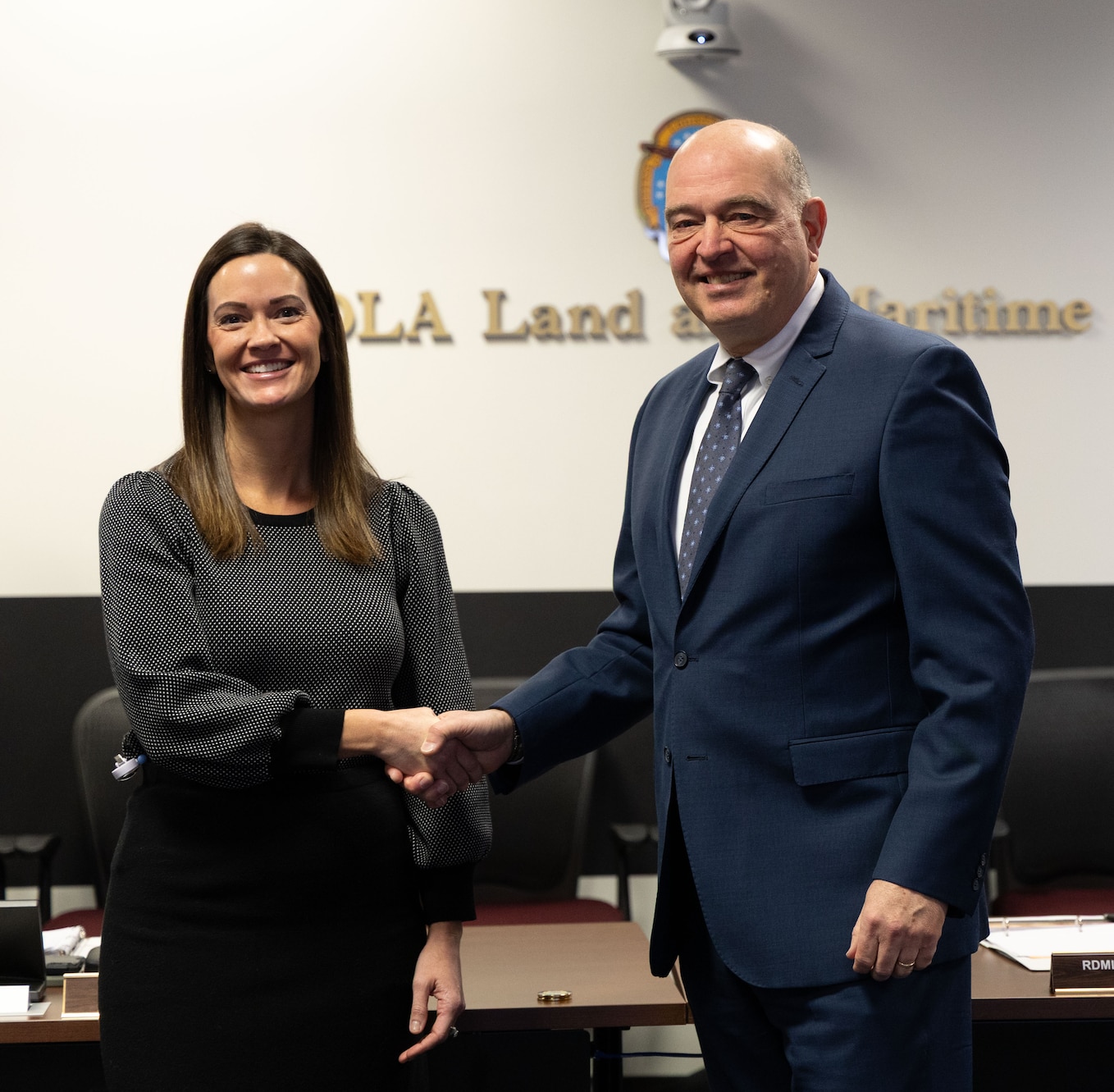 Defense Logistics Agency Acquisitions Director Matthew Beebe presents a challenge coin award to Brooke Blankenship during his visit Dec. 11 to DLA Weapons Support (Columbus). Blankenship is a contract specialist in the DLA Weapons Support (Columbus) Strategic Acquisitions Process Directorate. (Photo by Stefanie Hauck/DLA Weapons Support)