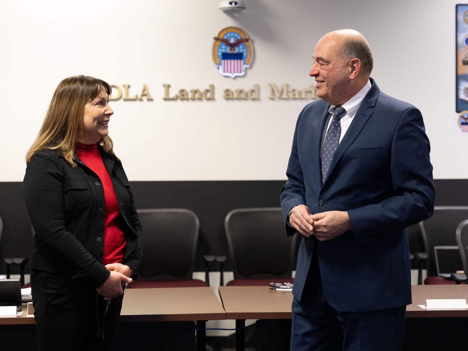 Defense Logistics Agency Acquisitions Director Matthew Beebe congratulates Jeanine Beisner prior to presenting her with a challenge coin award during his visit Dec. 11 to DLA Weapons Support (Columbus). Beisner is a supervisory procurement specialist in the DLA Weapons Support (Columbus) Procurement Process Support Directorate. (Photo by Stefanie Hauck/DLA Weapons Support)